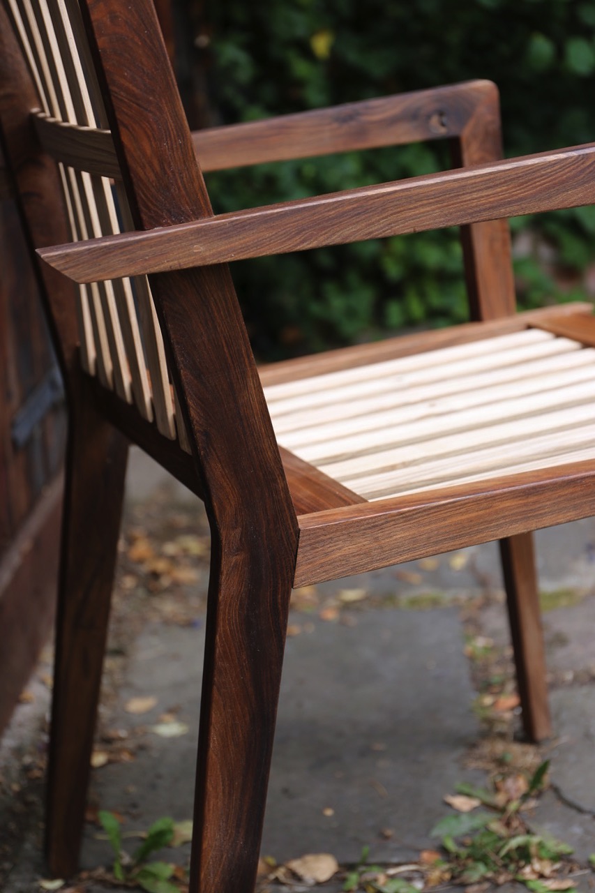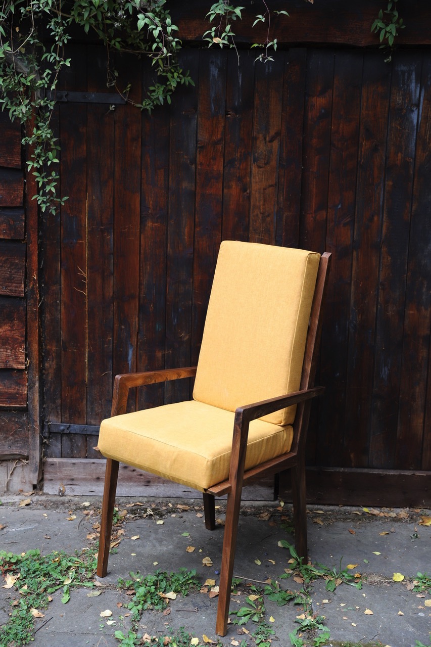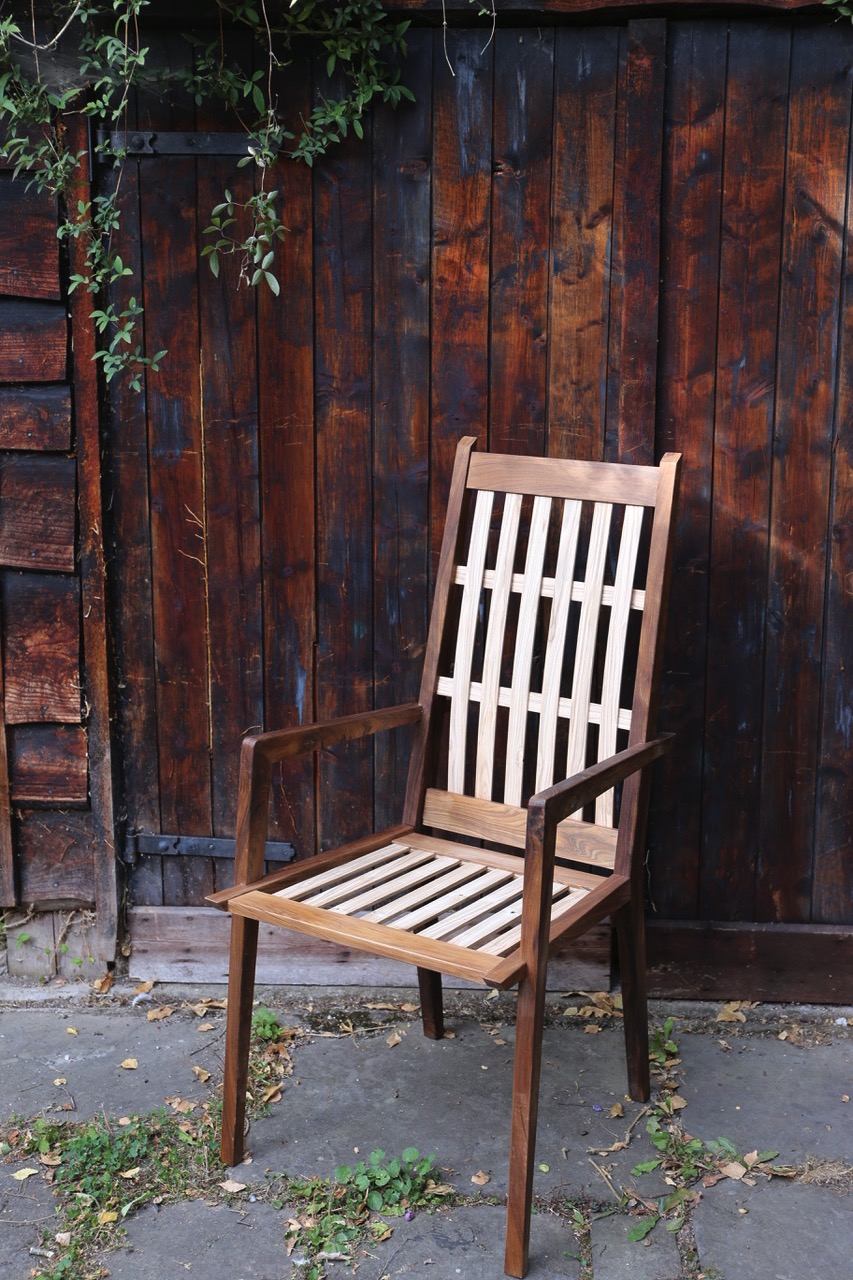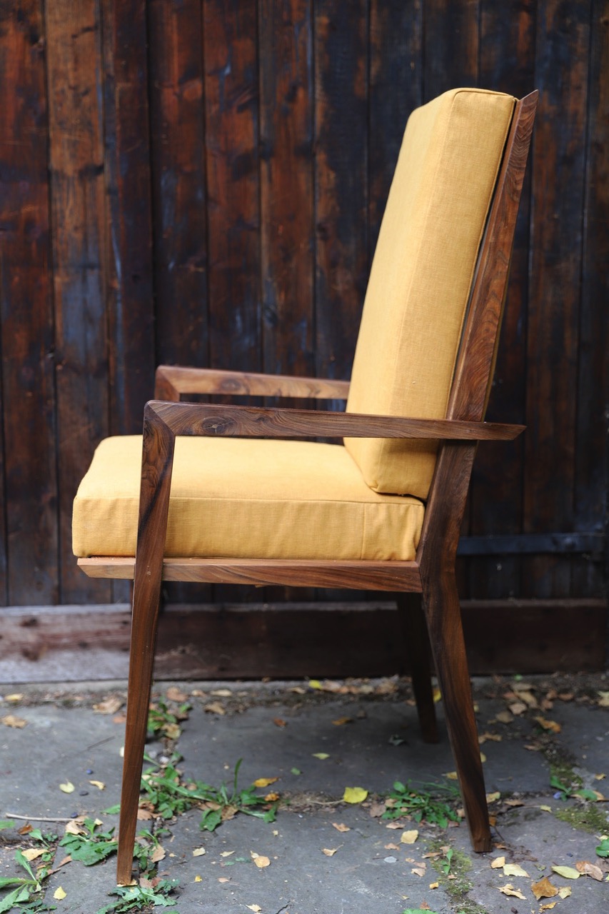 This partially upholstered walnut chair was made to replace an ugly alternative for someone who is still active but who has some mobility issues and who wanted something with a high straight back and a short seat she could rise easily from. While there is a whole industry connected with furniture designed around particular medical needs, very little of it is good-looking and even less of it gladdens the heart. I don’t see why age, injury or illness should mean forgetting style or delight.